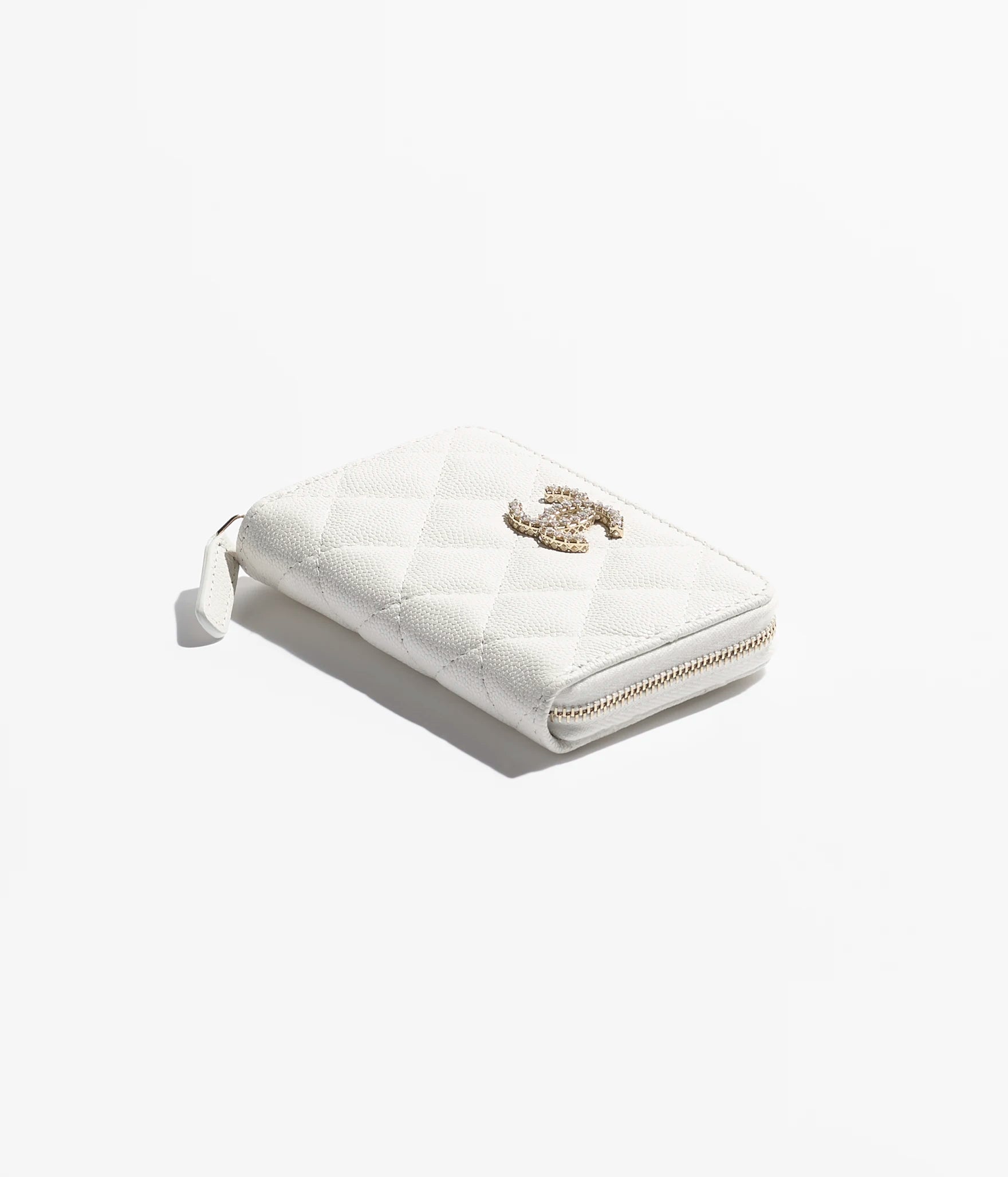 Chanel Zipped Coin Purse Shiny Grained Calfskin, Strass & Gold-Tone Metal - White